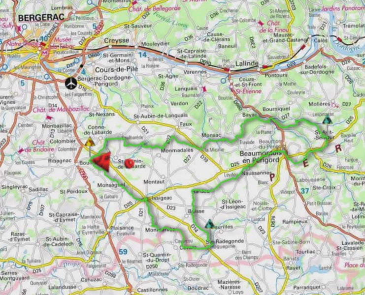 33 km Château de Bannes, rocher du Corbeau Village de Monsac, Vignoble des Verdots |